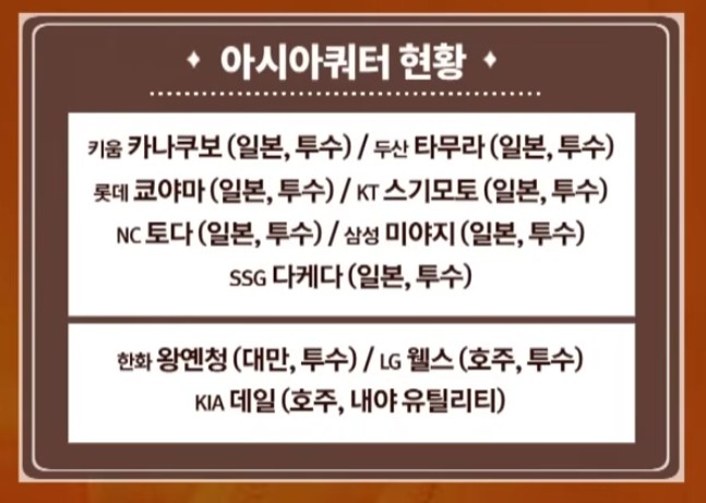 각 구단별로 아시아쿼터 선수에 대해 한명씩 덕후 시점으로 파보겠습니다.