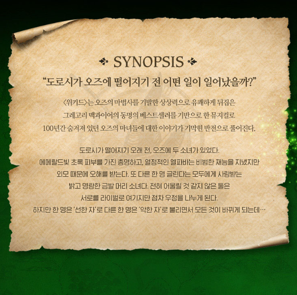 뮤지컬 <위키드>는 우리가 잘 알고 있는 동화 <오즈의 마법사>의 이야기를 완전히 뒤집은 프리퀄(Prequel)이다. (프리퀄이란 특정 작품의 이전 이야기를 다루는 작품을 의미한다.) 도로시가 등장하기 전, ‘서쪽의 나쁜 마녀’로 알려진 엘파바가 왜 그렇게 불리게 되었는지, 그리고 그 이면에 어떤 진실과 감정이 숨겨져 있었는지를 풀어낸다.