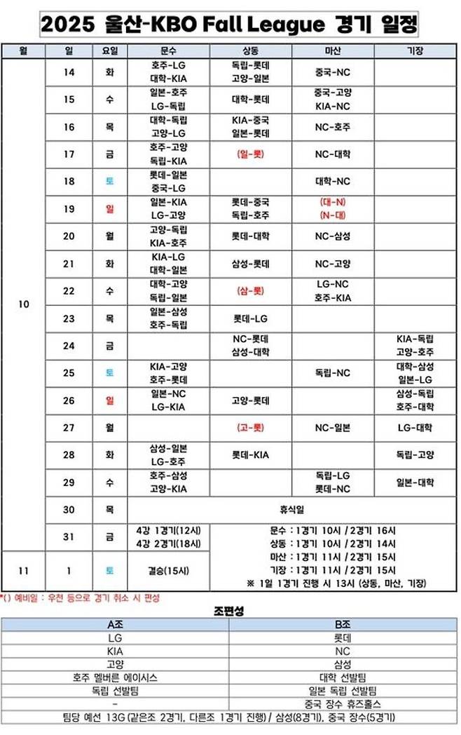 예선은 울산,상동,마산,기장 4개 구장에서 하루 최대 5경기씩 열리며, 결선 라운드는 10월 31일~11월 1일 울산 문수구장에서 진행됩니다. 중계는 아래 채널을 통해 시청할 수 있습니다.