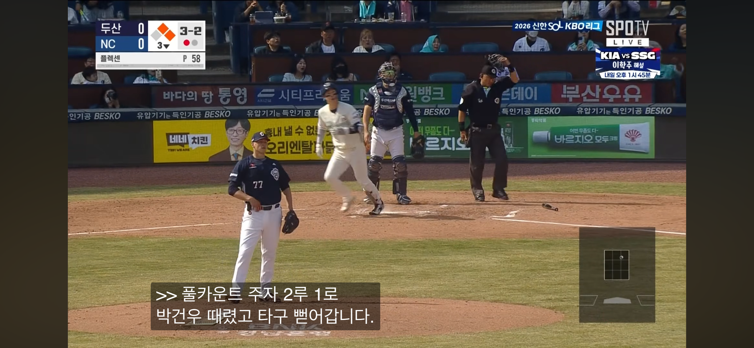 경기의 흐름은 초반부터 팽팽했다. 구창모와 크리스 플렉센의 선발 맞대결은 예상대로 쉽게 균형이 깨지지 않았다. 양 팀 모두 1회 찬스를 만들었지만 득점으로 연결하지 못하며 긴장감 있는 흐름이 이어졌다. 개막전 특유의 신중함이 그대로 드러난 순간이었다.
